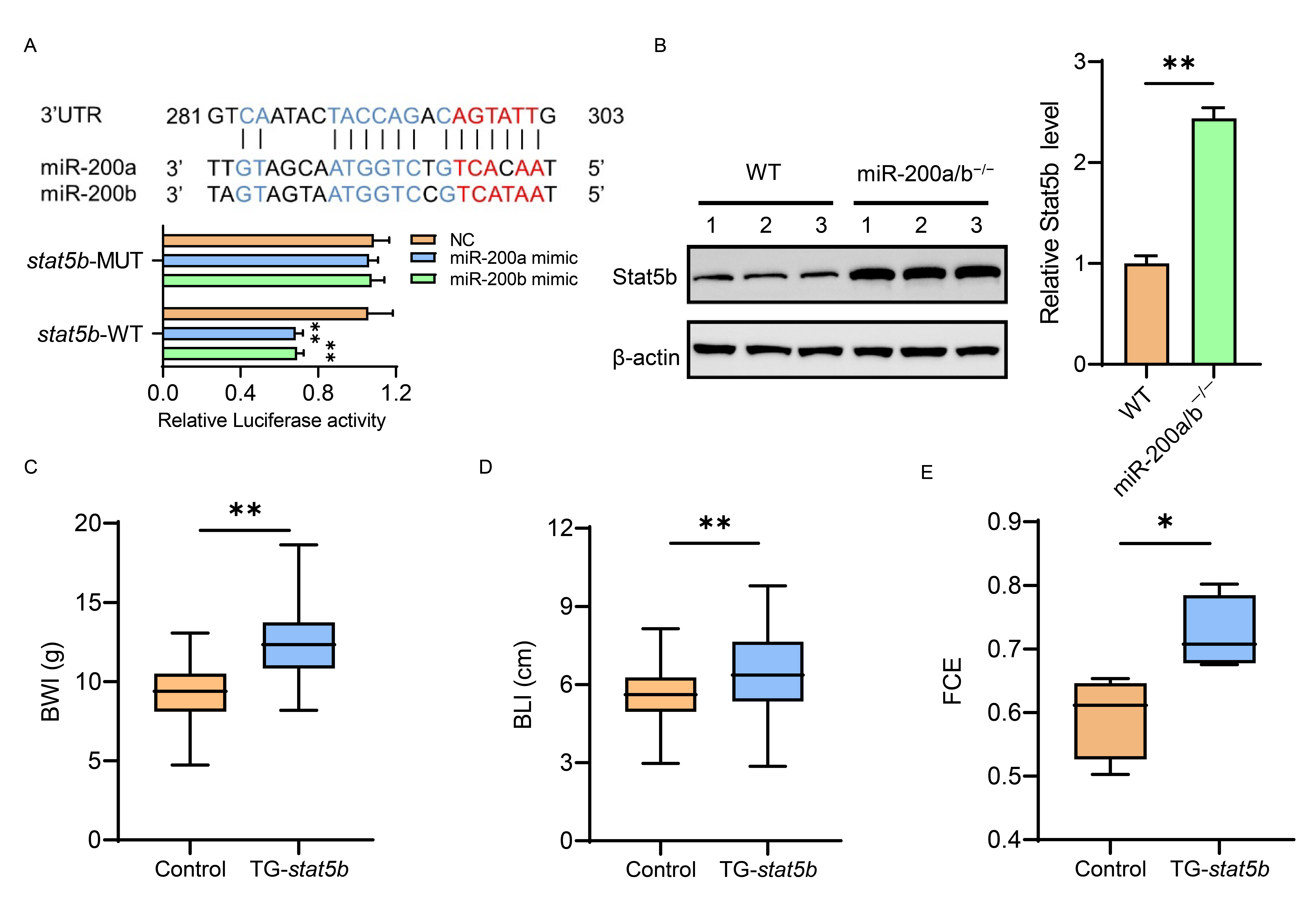 图3 miR-200a/200b顺利获得靶作用stat5b调控黄颡鱼的生长与饲料转化率